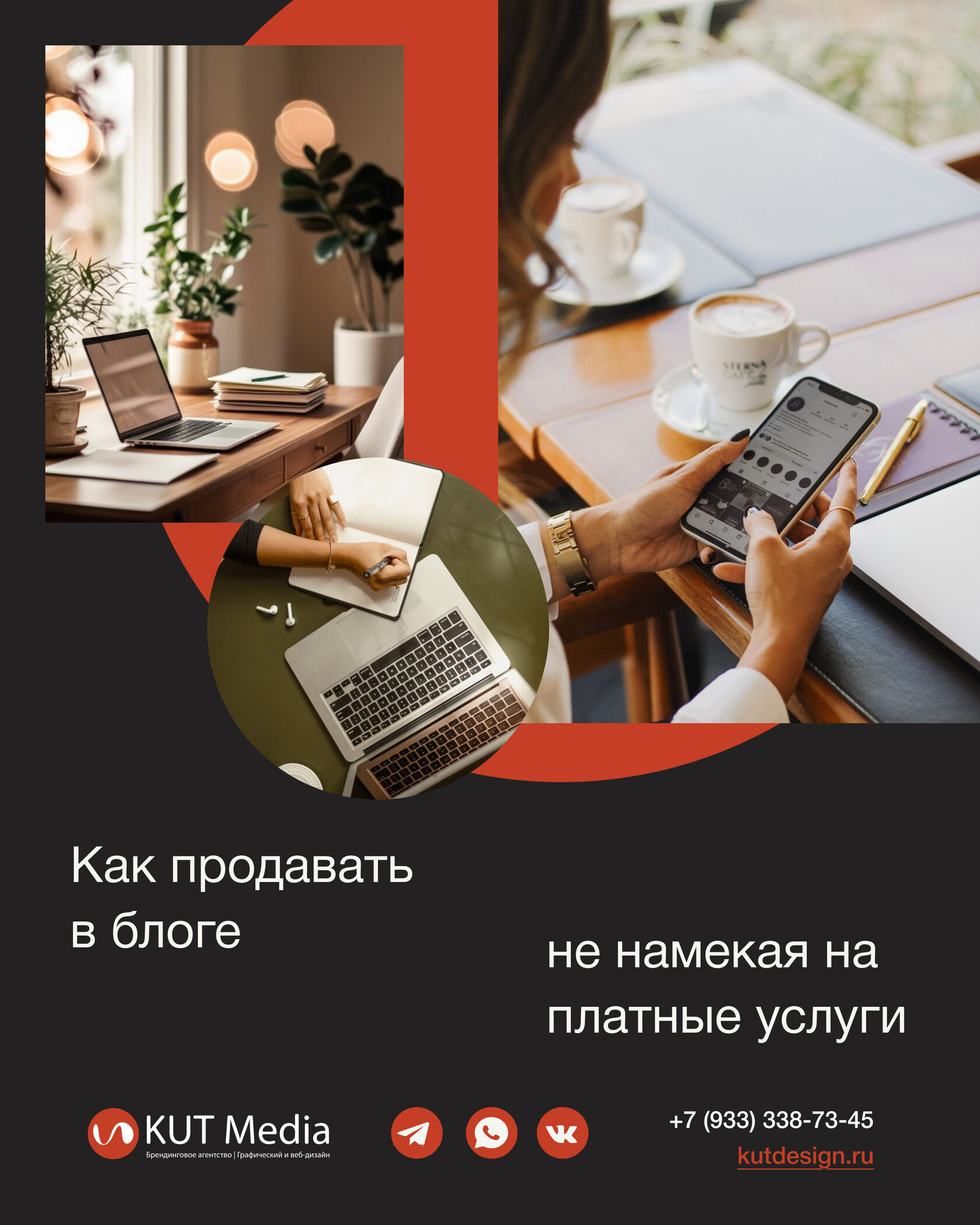 KUT Media: Мы специализируемся на создании фирменного стиля, полиграфии, разработки сайтов любой сложности и регистрации товарных знаков. Для обсуждения деталей сотрудничества свяжитесь с нами любым удобным образом по тел. 8 933 338 73 45 или Telegram / WhatsApp